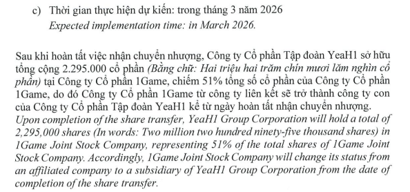 Sau khi hoàn tất việc nhận chuyển nhượng, YeaH1 sẽ sở hữu tổng cộng 2,29 triệu cổ phần, tương đương 51% tổng số cổ phần, qua đó trở thành công ty mẹ của Công ty cổ phần 1Game.