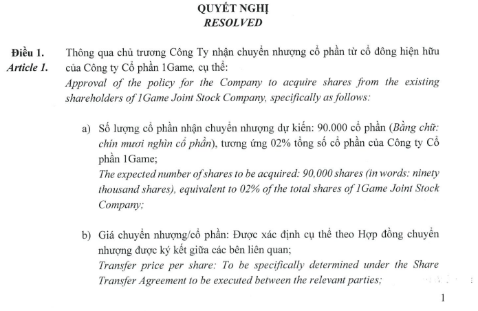Sau khi hoàn tất việc nhận chuyển nhượng, YeaH1 sẽ sở hữu tổng cộng 2,29 triệu cổ phần, tương đương 51% tổng số cổ phần của Công ty cổ phần 1Game.